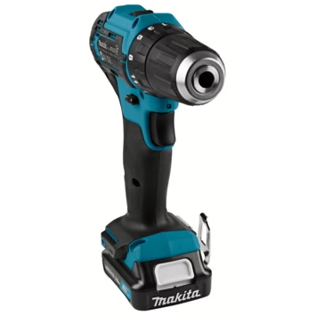 De Makita accuboormachine DF332DSAJ 12 Volt is een smal en licht gereedschap met een krachtige werking. De boormachine heeft 2 accu?s van Lithium-Ion. Door het Lithium-Ion hebben de accu?s geen last van zelfontlading of geheugenverlies. Door het gebruik van een accu heb je geen gedoe met snoeren. De accu?s zijn door de meegeleverde snellader in een halfuurtje weer helemaal klaar voor gebruik. Dankzij de koolborstelloze motor krijg je perfecte resultaten. En met de tandwieloverbrenging gaat de machine lang mee. De elektrische motorrem zorgt dat je altijd de optimale controle hebt over de boormachine.