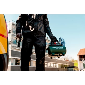 De Metabo Basic 160-6 W OF compressor komt goed van pas als u perslucht nodig heeft. De werkdruk is maximaal 8bar, dat betekent dat hij geschikt is voor het oppompen van fietsbanden, opblazen van een luchtbed of voetbal en het schoonblazen van uw werkplek of gereedschap. Deze compressor is olievrij, Ook kunt u met deze Metabo compressor lichte tacker-werkzaamheden uitvoeren.