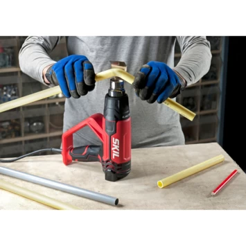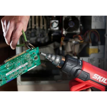 De SKIL 8040 is een krachtig 2000W heteluchtpistool en is ideaal voor een groot aantal klussen zoals het verwijderen van verf en stickers en het aanbrengen en verwijderen van wax op ski’s en nog veel meer. Dit heteluchtpistool wordt elektronisch geregeld, wat betekent dat de elektronica continu het temperatuurniveau van het gereedschap bewaakt en zo voorkomt dat het oververhit raakt. Hierdoor kunt u mondstukken met kleine diameters gebruiken voor diverse soldeer-, desoldeer- en lasklussen. Dit heteluchtpistool is compatibel met de meest gangbare, ruim op de markt verkrijgbare mondstukken voor heteluchtpistolen, zodat u altijd het juiste mondstuk voor uw klus kunt vinden. Met het handige LCD-display kunt u precies de juiste temperatuur en luchtstroom voor uw klus instellen. U kunt temperaturen instellen van 50 tot 650 °C en u kunt kiezen uit vijf luchtstroominstellingen van 250 en 500 l/min. Door de unieke uitwerpfunctie van de mondstukken kunnen ze altijd snel en veilig gewisseld worden, met name als ze heet zijn. Hierdoor hoeft geen enkele klus te wachten. De SKIL 8040 GA wordt geleverd in een draagkoffer met een reduceermondstuk, een reflectormondstuk, een 9-mm-reduceermondstuk en een plat mondstuk.